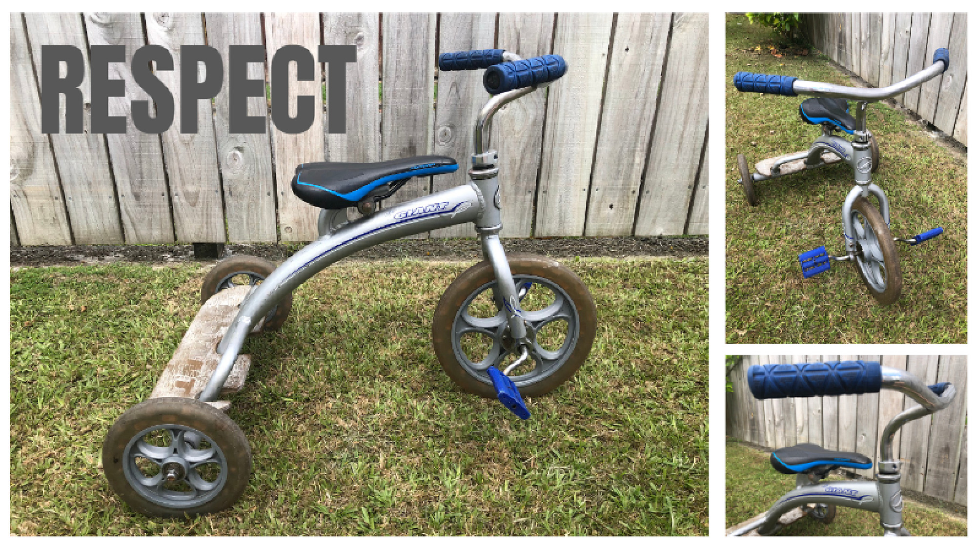 It was an old treasure that both our boys grew up with. I spent a good deal of time wire-brushing the superficial rust. Slightly longer with a toothbrush and sugar soap on the grips and rims. A few minutes restaining the deck and spray laminating. Flippin’ ages rubbing grease off and still longer replacing the seat. I can't remember where we got it, but may God bless them richly. It feels like a thousand kids have ridden it, and it has not batted an eyelid. I've seen grown men ride it and teenagers pedalling with a mate on the back. It is the Humvee of trikes.