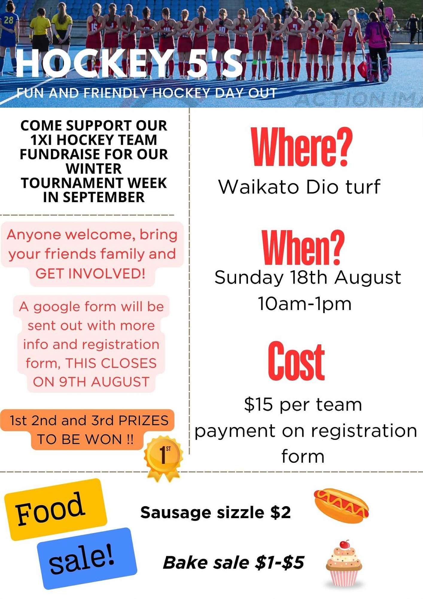 Winter Tournament week is fast approaching, and our 1st XI Hockey team are competing here in Hamilton. As a fundraising idea, our 1st XI are hosting a 5 a side hockey tournament. This will be a fun day out, where you and your friends and family can come along and play a bit of hockey (even if you have no idea how to play!). This is also open to our wider community so tell your friends!! There will be a bake sale and sausage sizzle throughout the day.