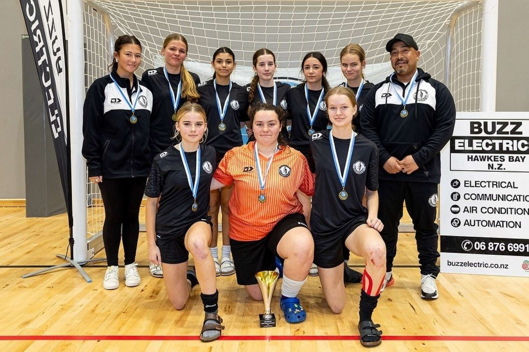 Over the school holidays, junior students Mia Humphrey, Freya Douglas and Alexis McNae competed in the Buzz Electrics Youth Futsal Tournament in Hawkes Bay at the Napier Pettigrew Green Arena. Mia and Freya represented the Titan’s Futsal Club, while Alexis represented the 4-Zero Club by captaining the U14 girls team. Both teams competed in the U16 Girls Division with the Titan’s team coming away as the overall U16 Girls Division winners! Well done to Mia who also won the tournament MVP award for U16 Girls Division. Awesome stuff, ladies!