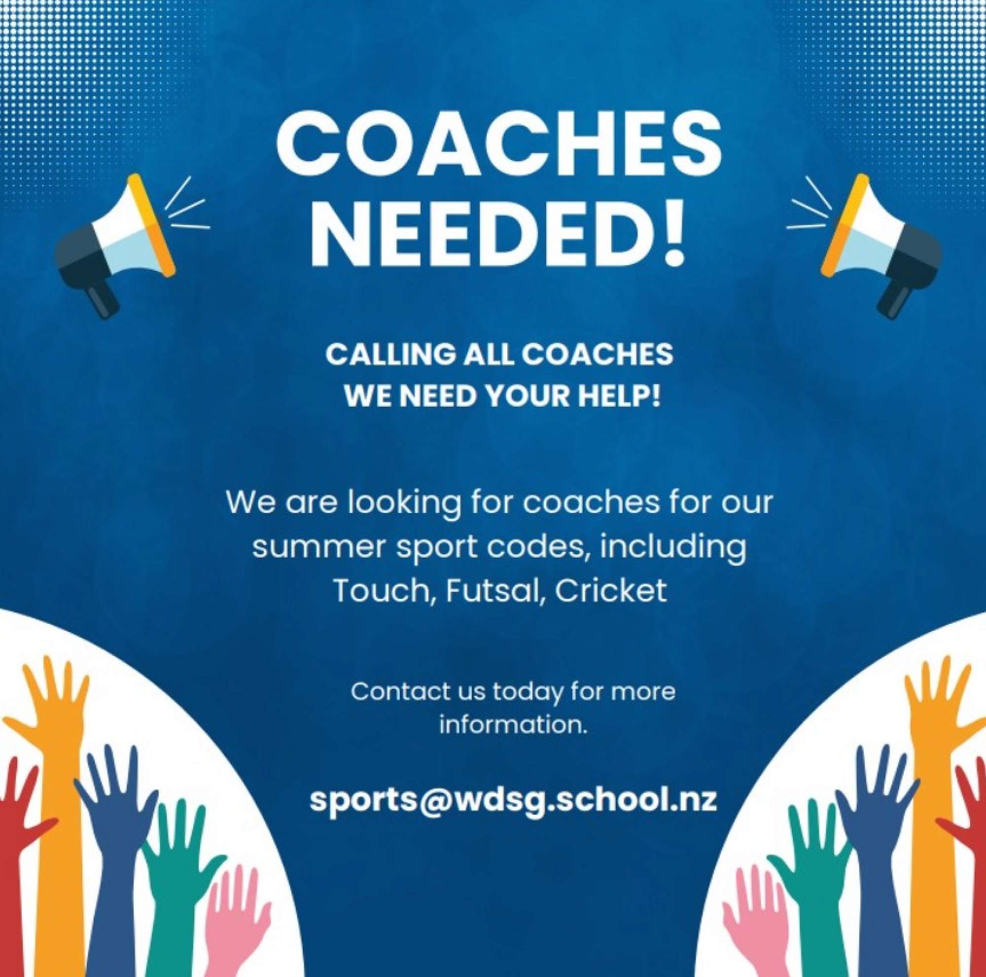 Looking ahead to the action-packed summer season, we're actively seeking passionate coaches for the following sports: Touch, Futsal and Cricket. Email: Contact our sports team directly at sports@wdsg.school.nz