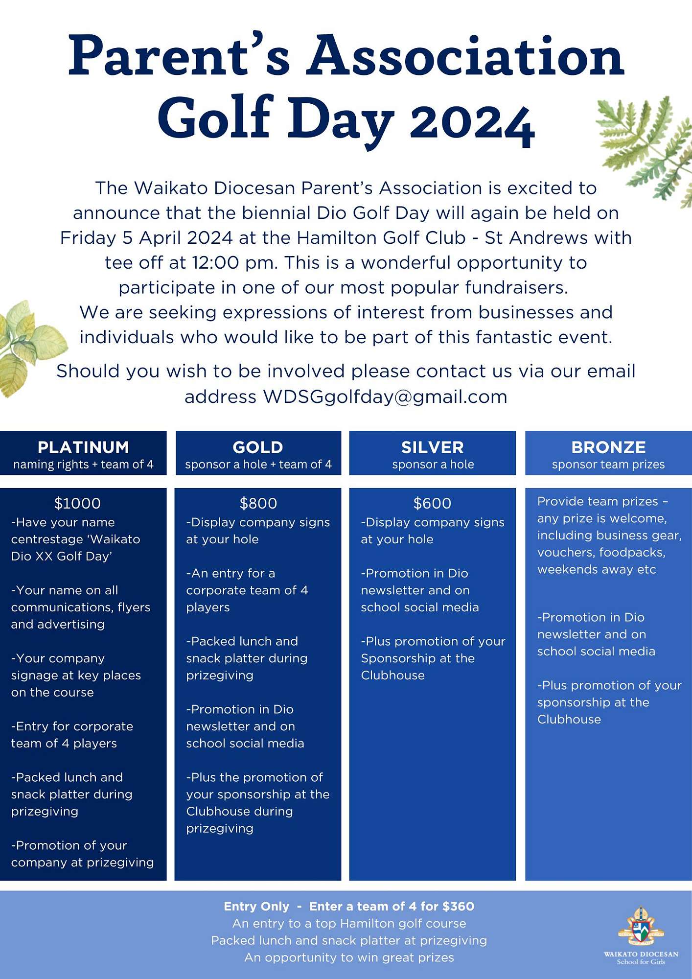 One of the events we have planned for next year is our biennial Golf Day on Friday, 5 April, at St Andrews Golf Course, starting at noon. This is always a great day and fun for golfers and nongolfers alike. Enter a team of four for $360 and receive entry to a top Hamilton golf course, a packed lunch and snack platter at prize-giving, and an opportunity to win great prizes.
