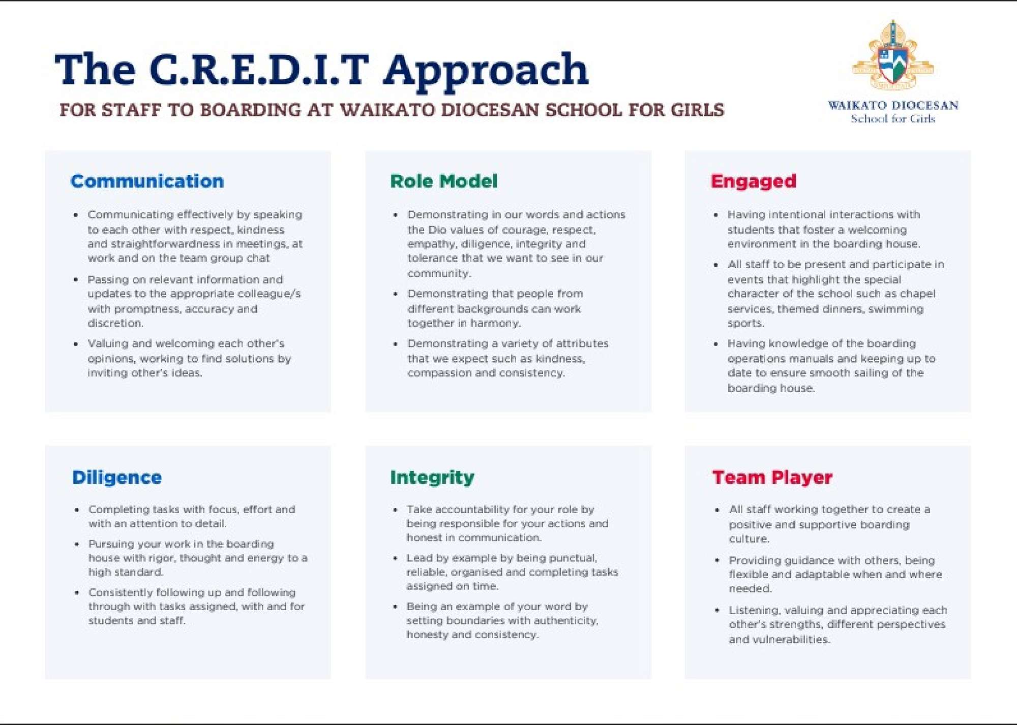 In 2023, the boarding staff co-constructed The C.R.E.D.I.T. Approach for Staff to Boarding to make explicitly shared focus and expectations of ourselves, other boarding staff, students and whaanau while on duty. Of course, we are not perfect and will continually strive to act to achieve these standards. This approach is displayed around the boarding houses and is another important foundation of our Anglican special character based duty of care.