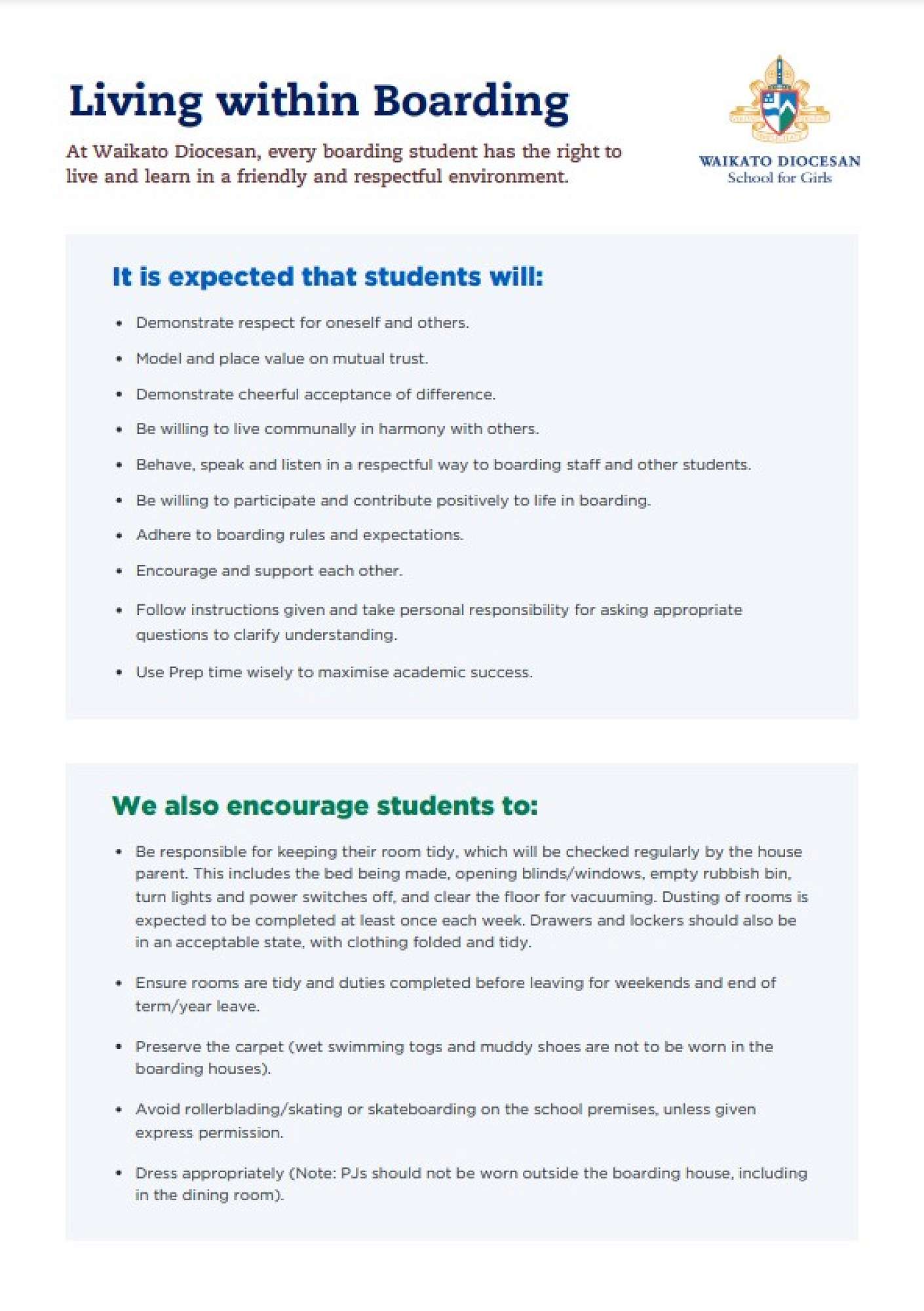 To fulfil these expectations, please continue to encourage and teach our boarders the below set of expectations, 'Living within Boarding', found on page 14 of our Boarding Handbook. Please click on the link to find an electronic version of this handbook. The below student expectations are displayed around the boarding houses, and are following them are key ensuring a positive boarding environment. Your support and help is appreciated.