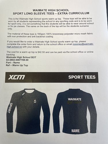 If you would like to order a Waimate High School sports warm up top, please complete the order form attached and return to the school office or email ncooney@waimate-high.school.nz with your details.