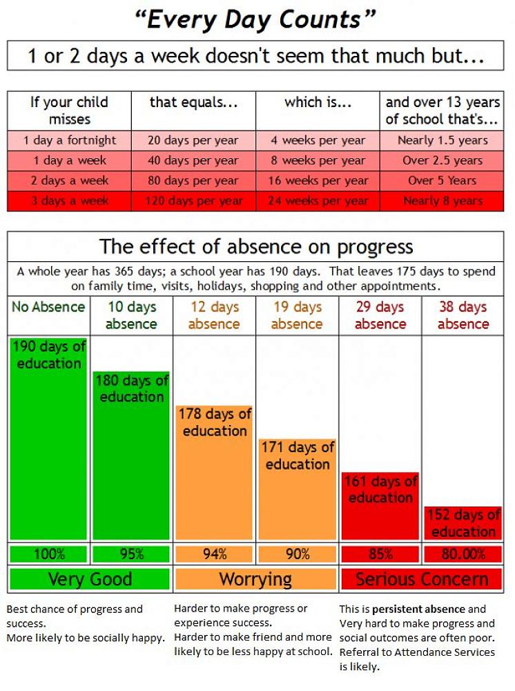 Any unexplained absence requires a note to be sent to school or home to make contact with the office otherwise this is changed to 'T' - Truant.