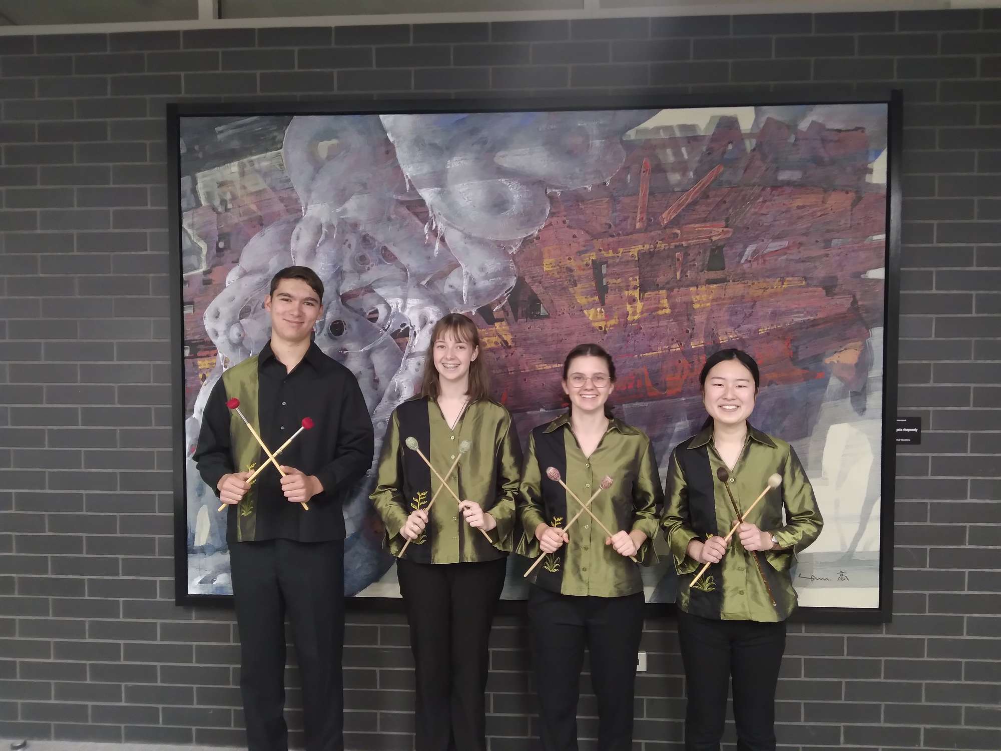 Our Percussion Ensemble, (Isabelle Russell, Jade Briggs, Riho Kawano and Sunny Neville), played a piece called 'Drumming Part 1' by Steve Reich on the bongos and were the Overall Winners. They are also now off to Christchurch to compete at the Regional Finals!