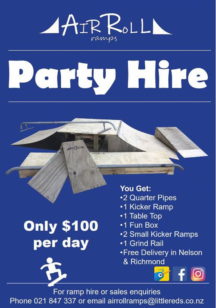 AIRRoLL ramps has a selection of skate ramps available for party and event hire. Cost of $100 per day. We also have ramps available for sale. To find out more email airrollramps@littlereds.co.nz , phone 021 847 337 or check out our Facebook page Airroll ramps
