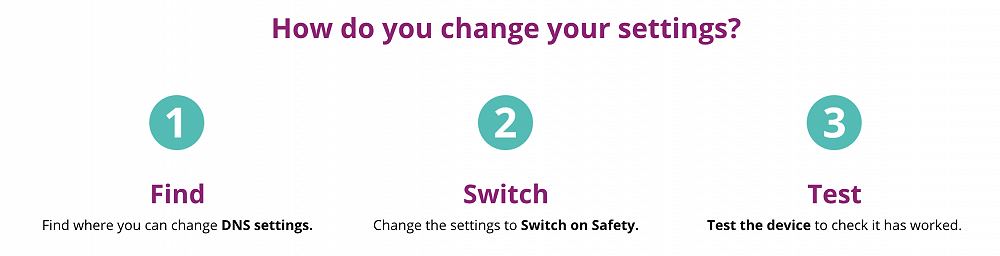 When children learn from home, it’s important to make sure they stay safe online. Here’s a simple, FREE way to block the worst of the web. To Switch on Safety, you need to change the ‘DNS’ setting on your child’s device. Simple instructions on how to do this are outlined below. Just click on the type of device your child uses below. To find out what’s blocked, read here.