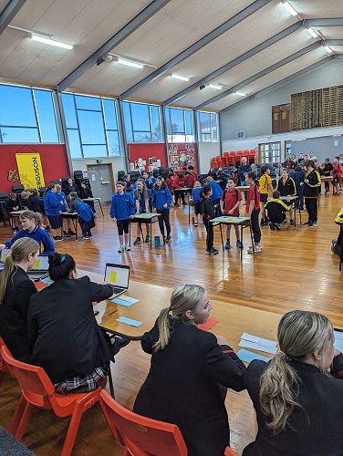 On Wednesday 30th August WGHS hosted the inaugural Waitaki Mathematics Association Year 5 & 6 Mathletics competition. Teams of 4 faced 20 tricky questions in a 30-minute time frame. As they came up with a solution the ‘runner’ from each team had to run up to their marker and get it checked before being given the next question and running a lap of the hall back to their team - hence “Mathletics”.