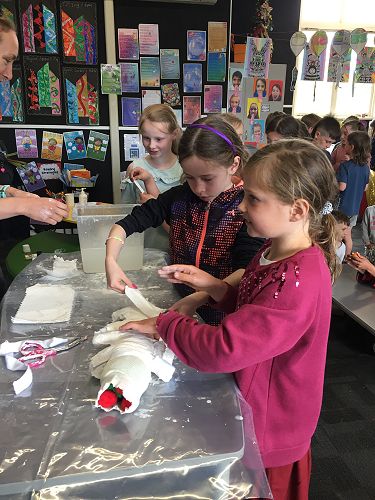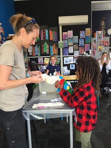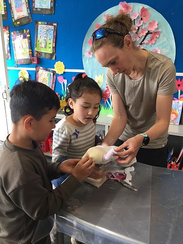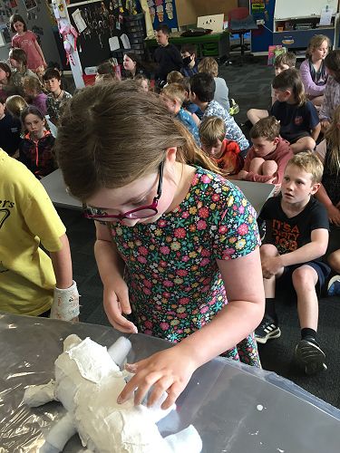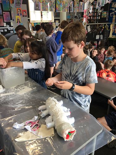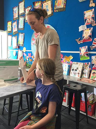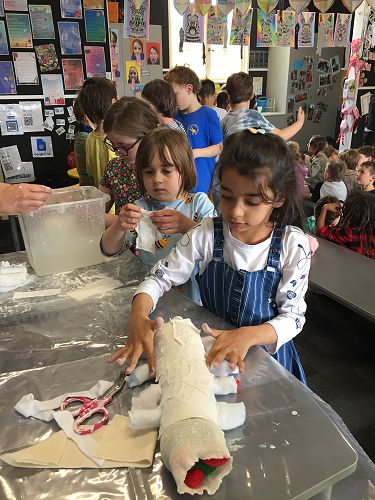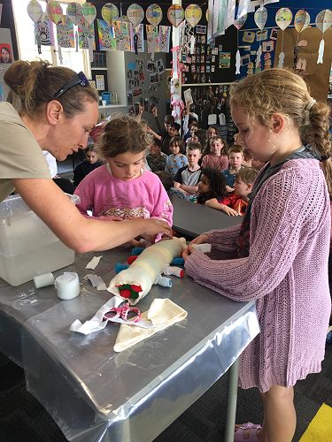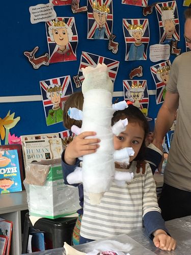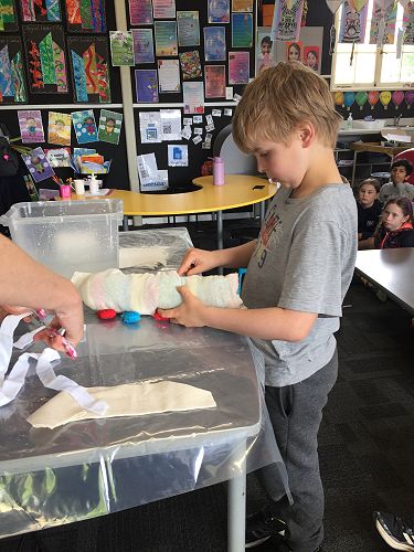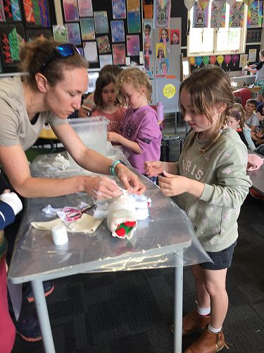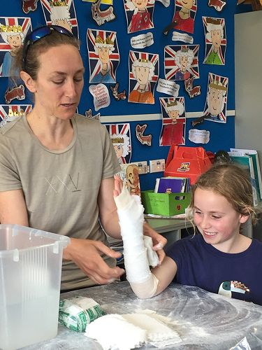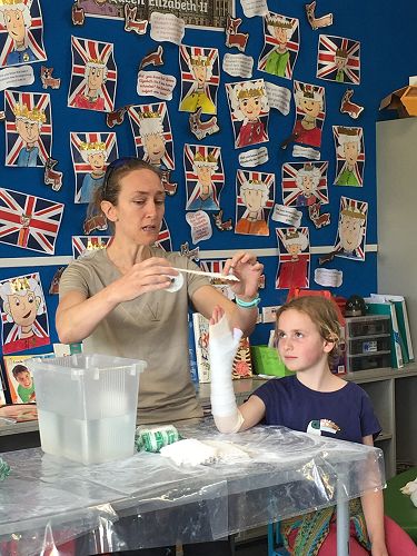 Next, Signe demonstrated how to put a real cast on Emma. We had to watch carefully, as after that we all got to help put a plaster cast on our toy caterpillar. Our caterpillar is well and truly immobilised now!