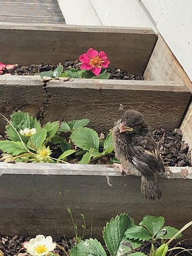 Today Flippy the bird tried to fly. It landed in the strawberry garden. It is two weeks old. We put a chalk around it. Its Mum and Dad will feed it. - Milly