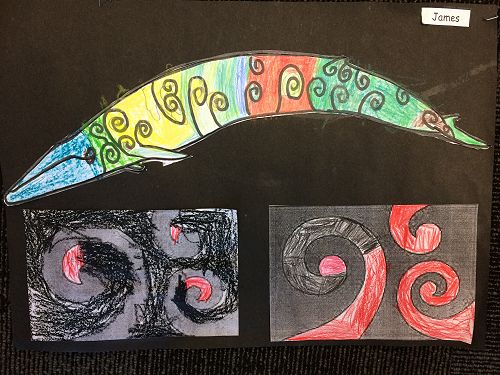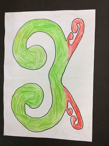 During Art, they learnt to draw korus and how to develop them into interesting kowhaiwhai patterns. Some children decided to use bright colours like the illustrations in books we saw and others preferred to use traditional Maori colours of red, black and white.