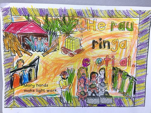 Ko te aha tenei ra? The children begin each day by asking what day it is and then answering in te Reo. They have learnt to respond to many Maori commands by playing Simon Says, for example horoi o ringa ringa (wash your hands) and whirihia o ringa (fold your arms). Together the children have decided on two Whakatauki, or sayings that they think will be good to work on as a class. One is, He waka eke noa (A waka which we are all in together without exception) and the other one is, He rau ringa e oti ai (Many hands make light work).