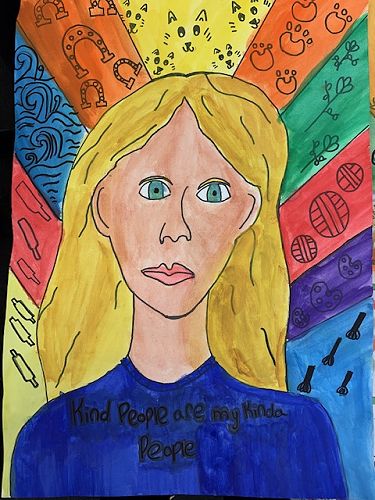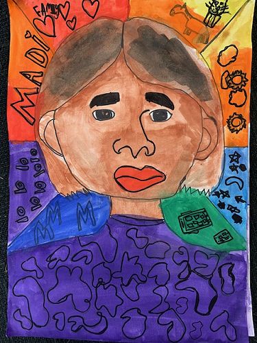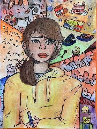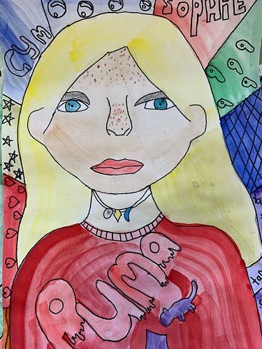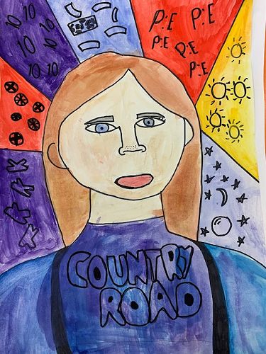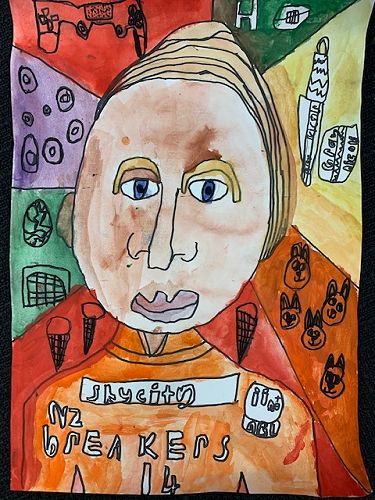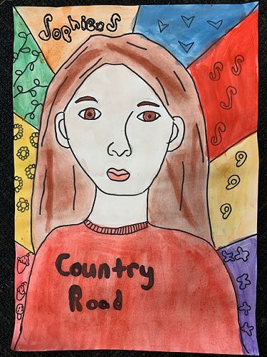 First we learnt how to draw a face accurately. The eyes are half way down the face. The nose bridge reaches to your eyes and the top of the mouth is shaped like two mountains and the bottom of the mouth is called a boat shape. Next we went over our work with sharpie and began to paint the face, neck and hair. When using water colour paints if the paper gets too wet it rips the paper. Use lots of colour and not much water to get a dark colour, and for a lighter colour use water and not much colour. After that we painted the top.