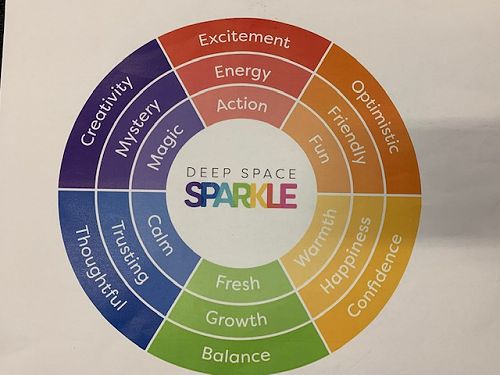 We used emotion colours to shade the background with pictures of symbols that describe us. Red is excitement, action and energy. Purple is creativity, mystery and magic. Blue is calm, trusting and thoughtful. Green is fresh, growth and balance. Yellow is warmth, happiness and comfort. Orange is friendly, fun and optimistic.
