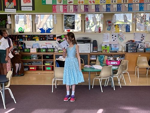 My favorite thing about drama is that I have the very first line and it's very fun because I have so many people playing in it. We get to choose your outfit and I have a beautiful blue dress and I have buddy so I'm Narrator 1&2 Ollie my Narrator buddy is narrator 3&4. Emily H