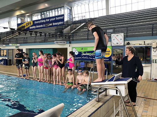 Today we were doing diving off the block. Last week I did a dive off the big diving board. I was nervous at the start then I did it. By Brayden
