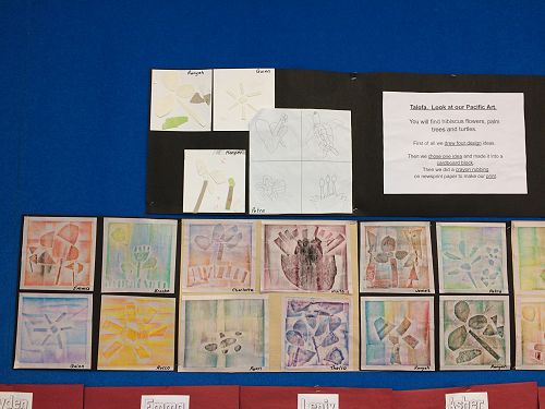 The 'Little Artists' have been creating original Pacific artworks as crayon-rubbing prints, after selecting their chosen design from turtles, flowers and tree drawings. Do come and see them up on the wall together with the process required to create the prints.