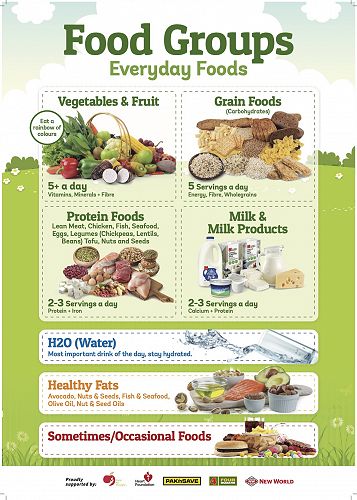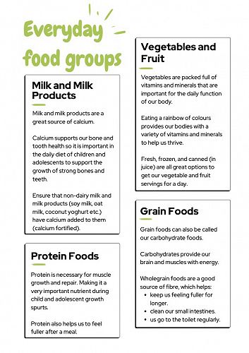 Session 1 involved learning about the wide range of food groups and nutrients. We learnt about everyday foods and sometimes foods. We found out that foods can be put in different groups. These are vegetables and fruits, grains, proteins and milk products. Check out the food groups picture below!