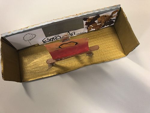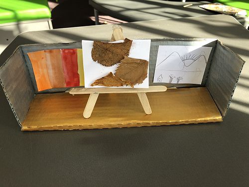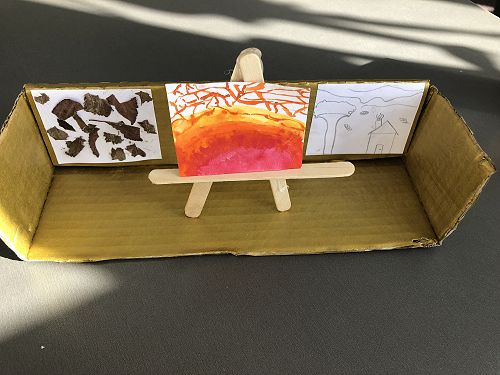 "Today I am having a tour around Esmes Art Gallery to see what is on display. I can see an amazing water colour sunset sitting on an easel. Behind it is a perfect sketch of a leaf, an Autumn leaf. This collage really shows the colours of Autumn. It is just amazing at Esmes Art Gallery. The room is painted silver and golden. These pieces must be priceless! I wonder if the people who work in here will buy more pictures to hang in this amazing gallery then I can come back again."