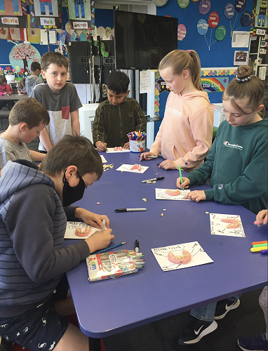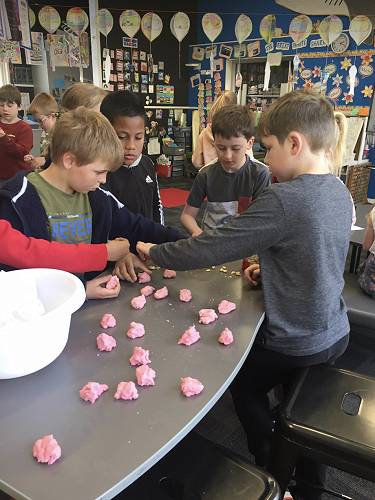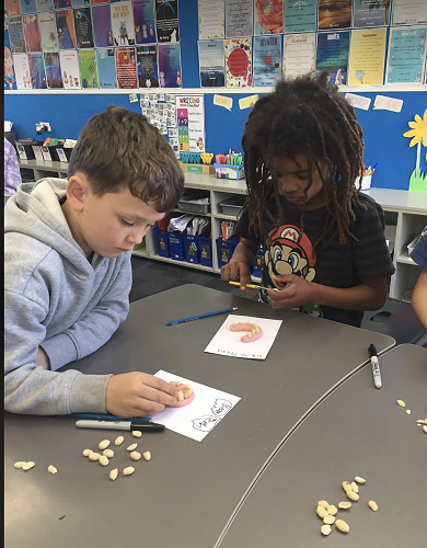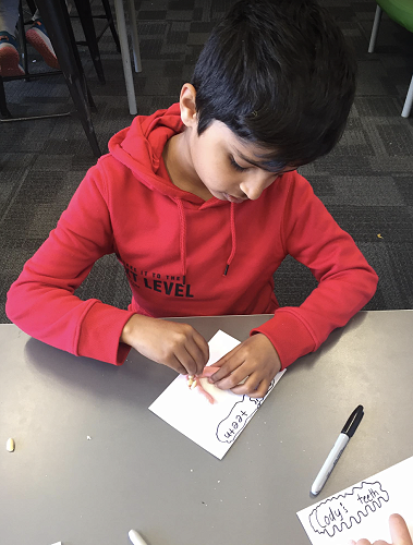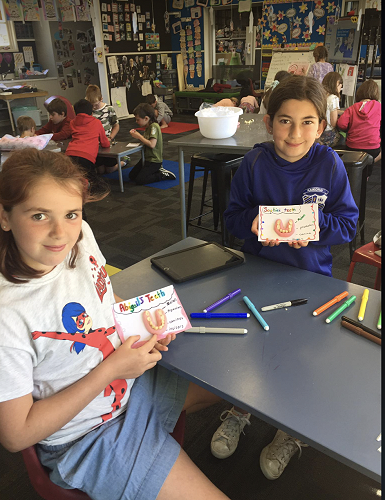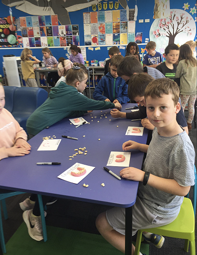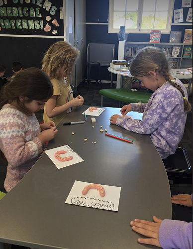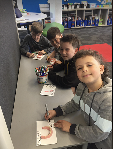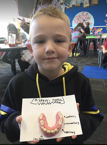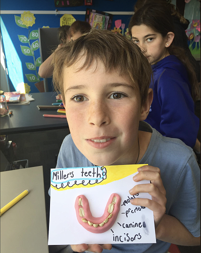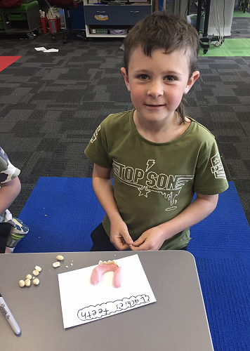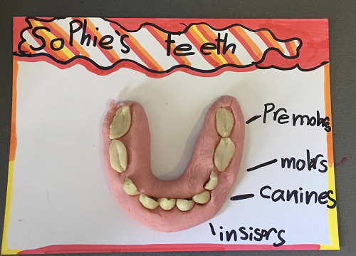 Next we got busy making models to show our learning. We used pink play dough for the gums and peanuts to show the different types of teeth. We also labelled our models carefully. We think they look pretty realistic, do you?