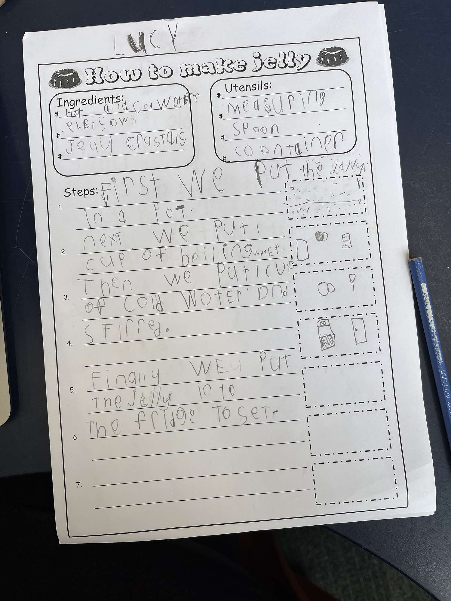 Over the week we continued to make the different layers of the jelly and some tamariki continued to write their own set of jelly making instructions.