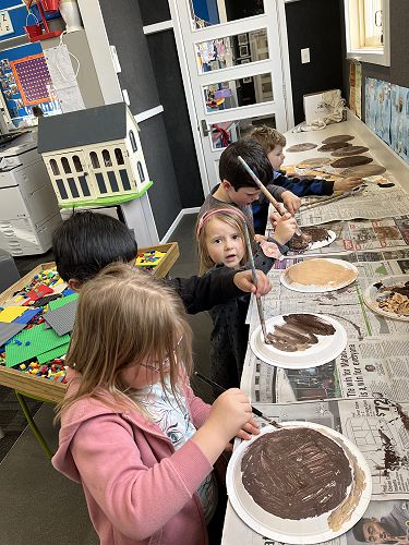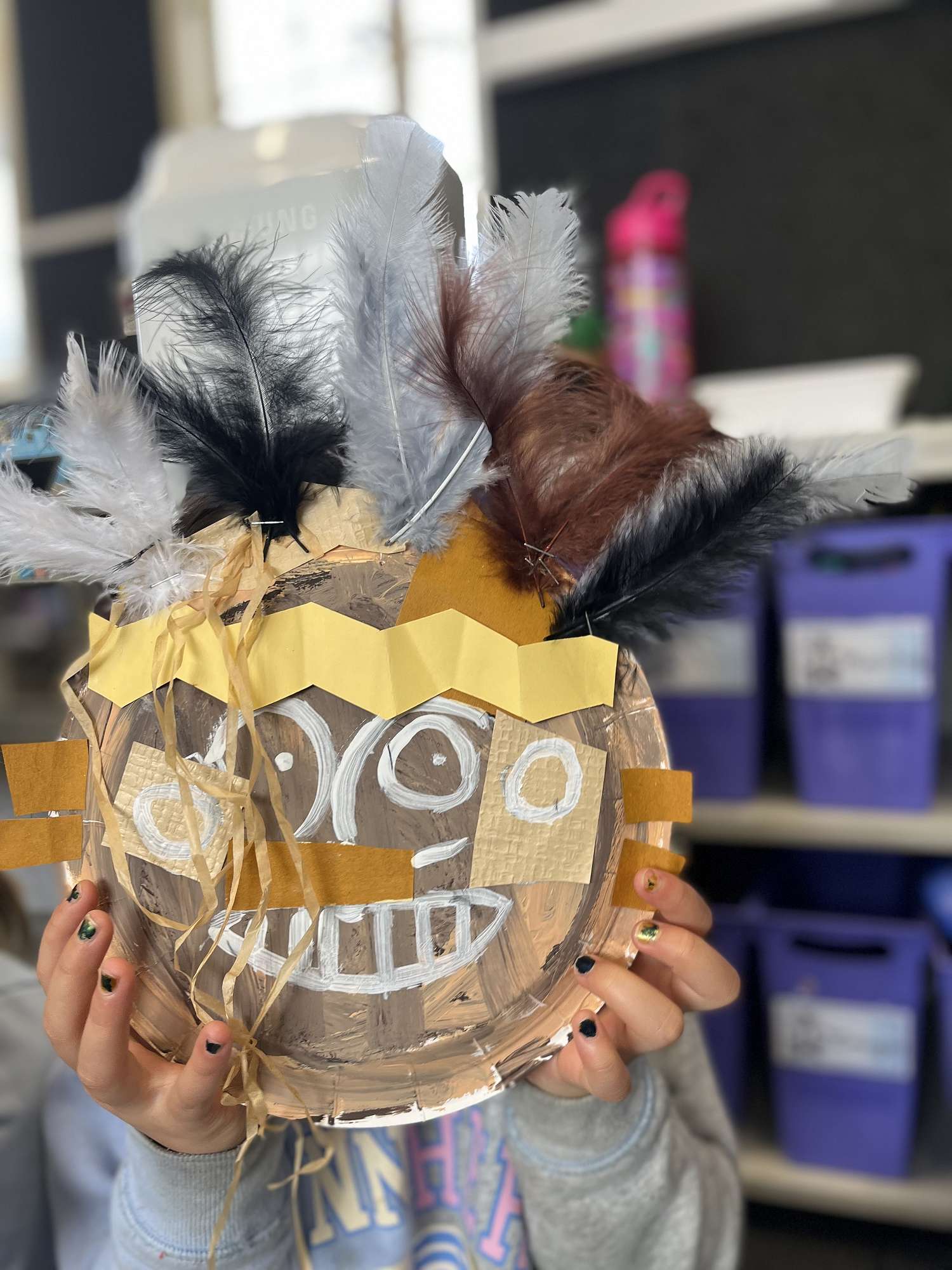 We started by painting the base of our masks (paper plates) different shades of brown to resemble wood and bark.