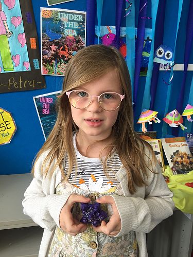 Last week we made our very own starfish. First of all we crafted our starfish out of salt dough. Next we used skewers to decorate the top of them. After that we baked them for a long time in the oven. Lastly we painted them, and put PVA and glitter on them.