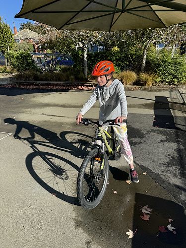 After we learned that we learnt how to start the bike. How you do that is you have one of the pedals on the left side and you push off and you are riding your bike. Next we learnt how to gently stop with using brakes safely so that you don't fall off. You safely pull two of your brakes. When we were learning that we played a game. Lily would say "green" and you would keep going. If she said "orange" you would softly be braking and if she said "red" you would stop!