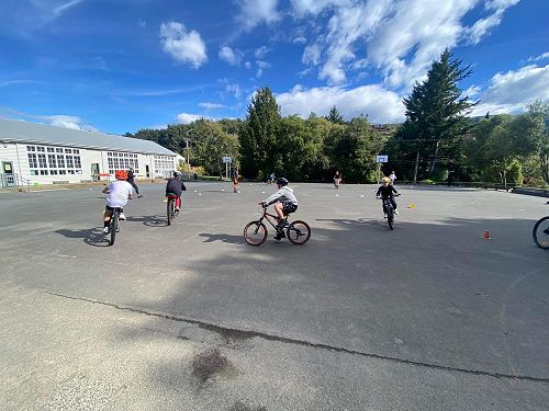 Next we rode around using that technique. After that, we lined up on the edge of the playground and Rose told us to hop on the bike and put one leg down. She went down the line putting her knees either side of our bike and told us to do the gorilla position. She took her knees off my bike and when she told me I got unstable.
