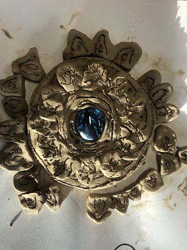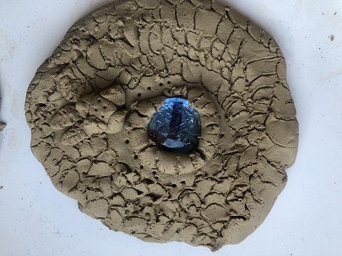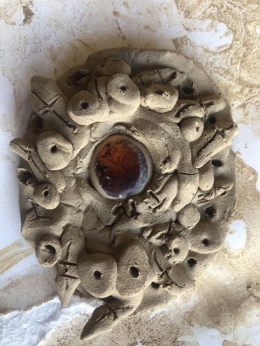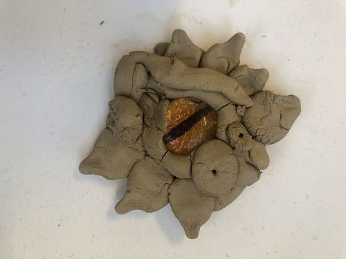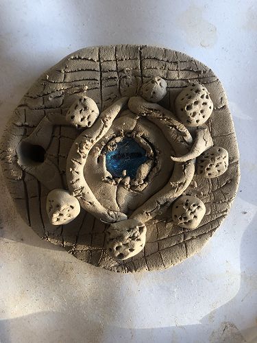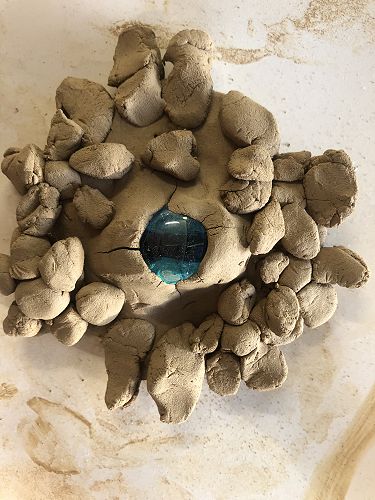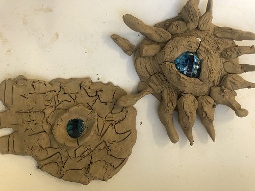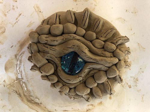 "I really enjoyed using the clay to make my dinosaur eye. My eye has flowers on it. I used water to help stick the little pieces on. I curled little serpents to add details and to make the petal of my love heart flower." - Beth