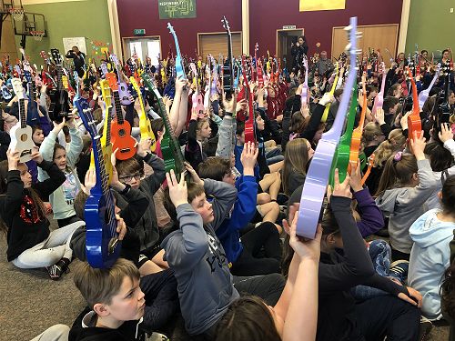 On Wednesday the Senior Uke group went to Tahuna Intermediate to play ukulele with different schools across Otago. There were over 500 kids there! We played songs that we have been practicing. After a couple of songs we all had morning tea. I saw some of my friends from my rugby team. After morning tea we starting playing the ukulele again. At the end of the ukulele jam all of the teachers went up in front of the stage and danced to 'Eye of the Tiger'. It was amazing. There were also 3D ukuleles that were in a competition. I liked doing ukulele jam - it was awesome! By Jake Hill