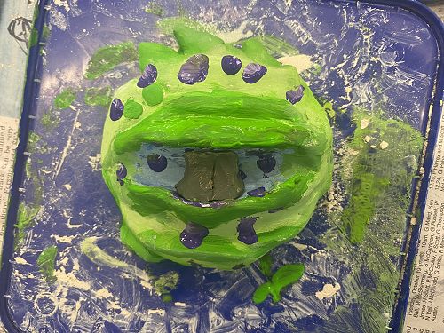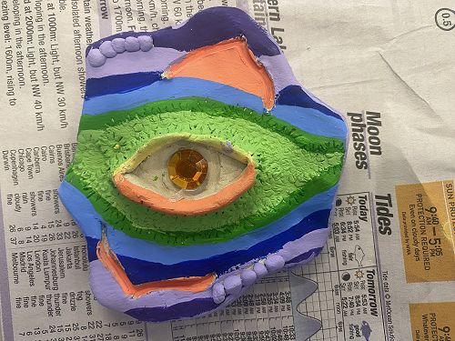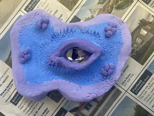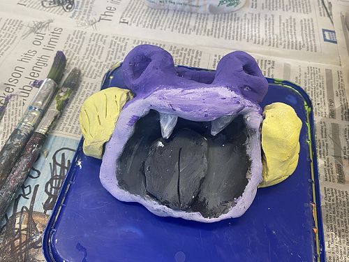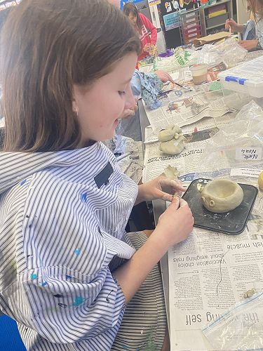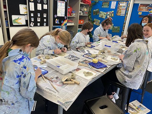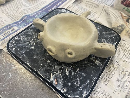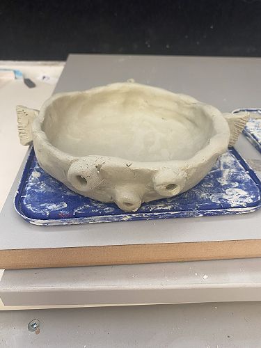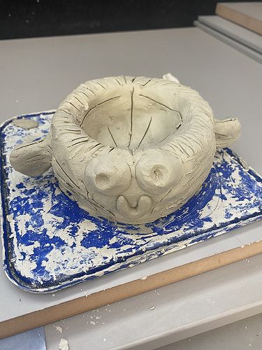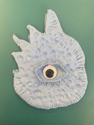 In the classroom, a group of students have been working with clay. Their first task was to create a dragon's eye, then they moved on to fish. They focused on the features, especially the eyes, fins, tail and mouth. Some combined the fish idea with a pinch pot.