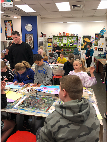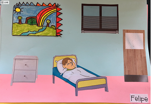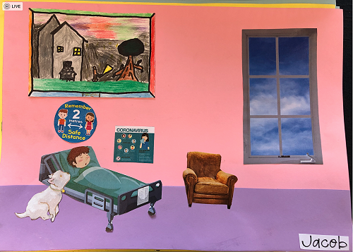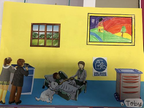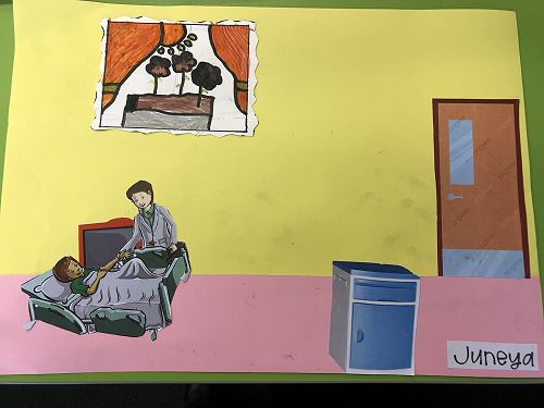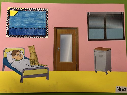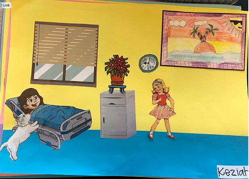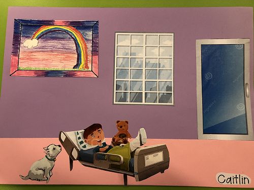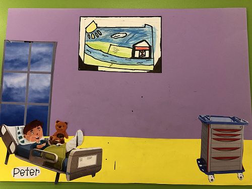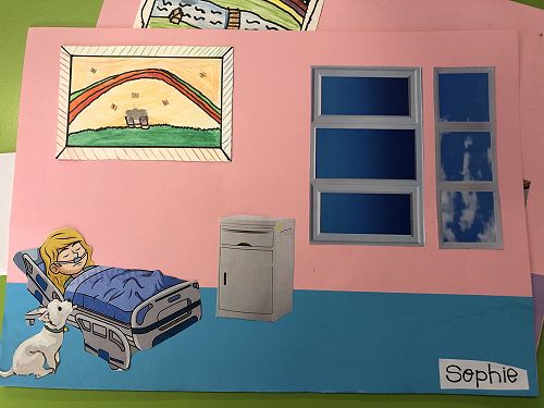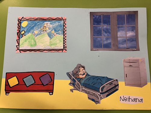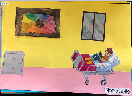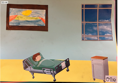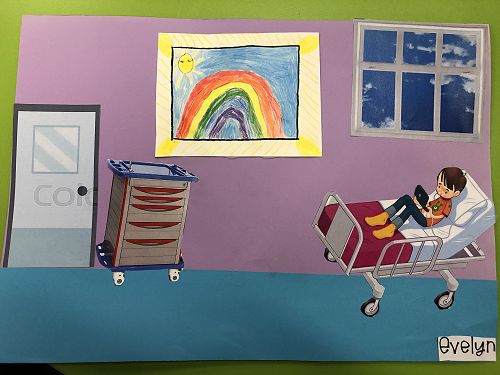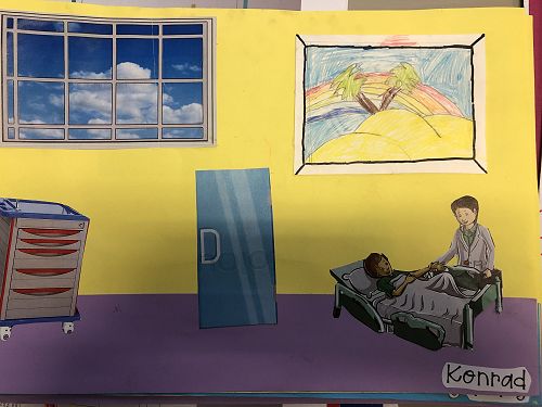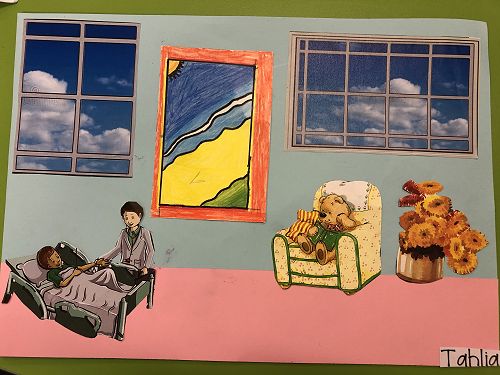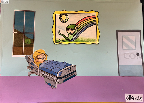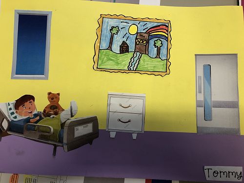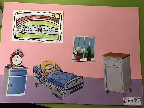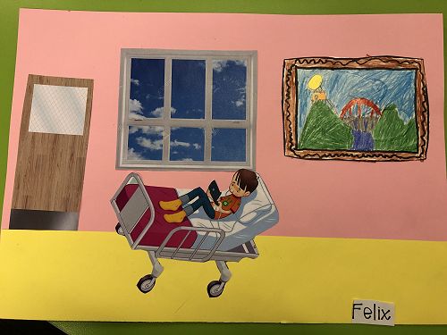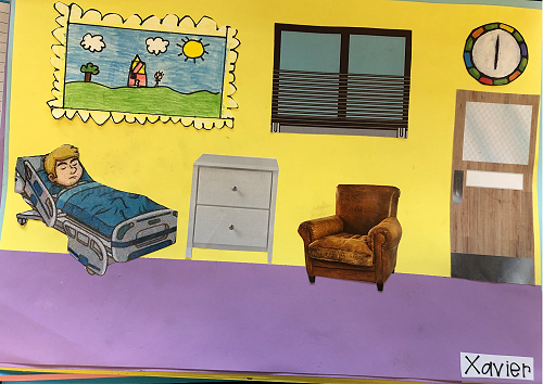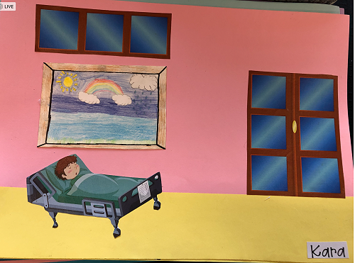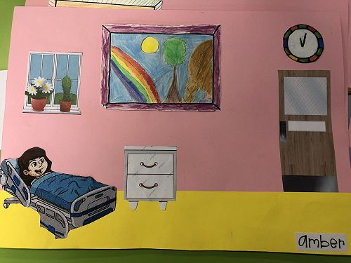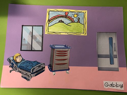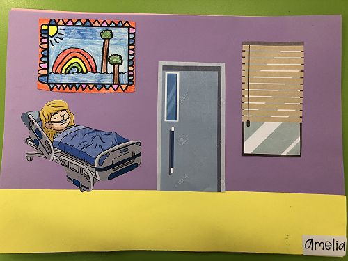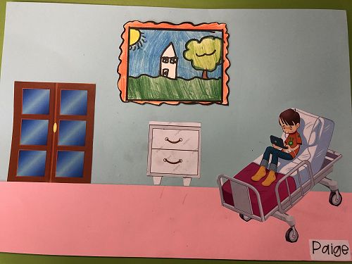Then we went up the elevator to get up to the second floor. It was scary, I hung onto Jack for the whole time in the elevator. We walked around for a little but there was nothing interesting. So then we went to the art room and saw some 1950 videos. Then John showed us what art we were going to do. We did this art where we were going to draw a happy picture to go in a child’s hospital room. I drew a green hill with a tent, some trees and a stream. Once we finished the picture we stuck some beds, windows and the picture plus some decoration to a piece of paper. I was one of the first to finish so I went outside and played with some toys that were in a box. Once everyone finished we packed up and went back to school. It was an awesome experience!!
