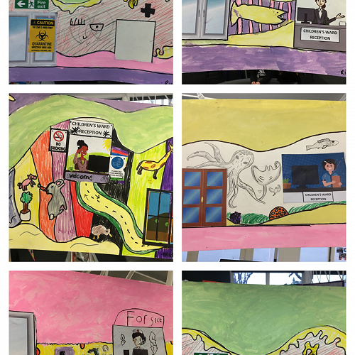 Visit this articleOn our recent visit to the art gallery we learnt about hospital care in early times. We found out that the first hospital in Dunedin was right in the Octagon where the town hall now is. John got us thinking about things that we might like to see in our new Dunedin Hospital. Our artwork showcases our ideas for art that we'd love to see in a hospital corridor.