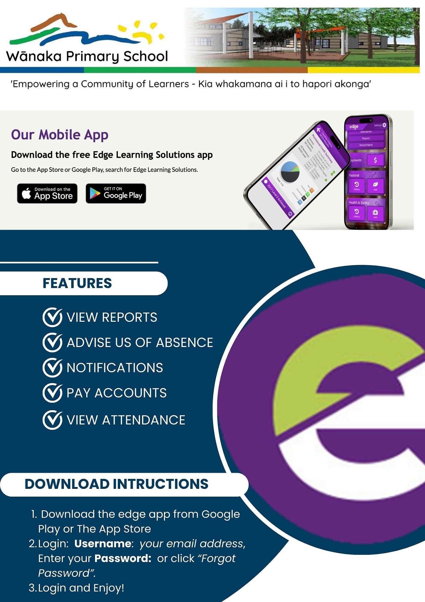 As a school, we want to streamline our communications with parents/caregivers and the Edge App will be really useful for this. Edge is our School Management System and it is used for a range of teaching, assessment, analysis, and administrative purposes. It is also a great tool for parents to communicate with us and to be engaged with your child's learning and progress at school.