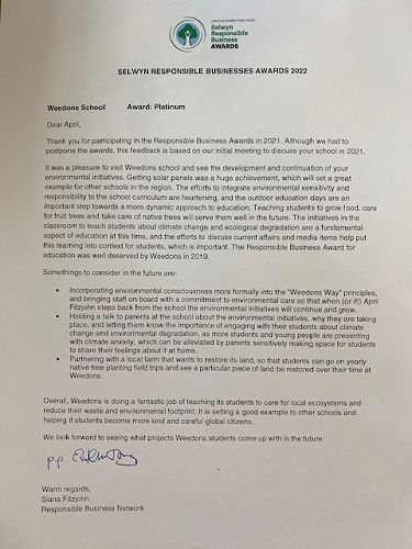 The wonderful work that the staff, students and Board do at Weedons school to help the environment was recognised at the Selwyn Responsible Business Awards last week.