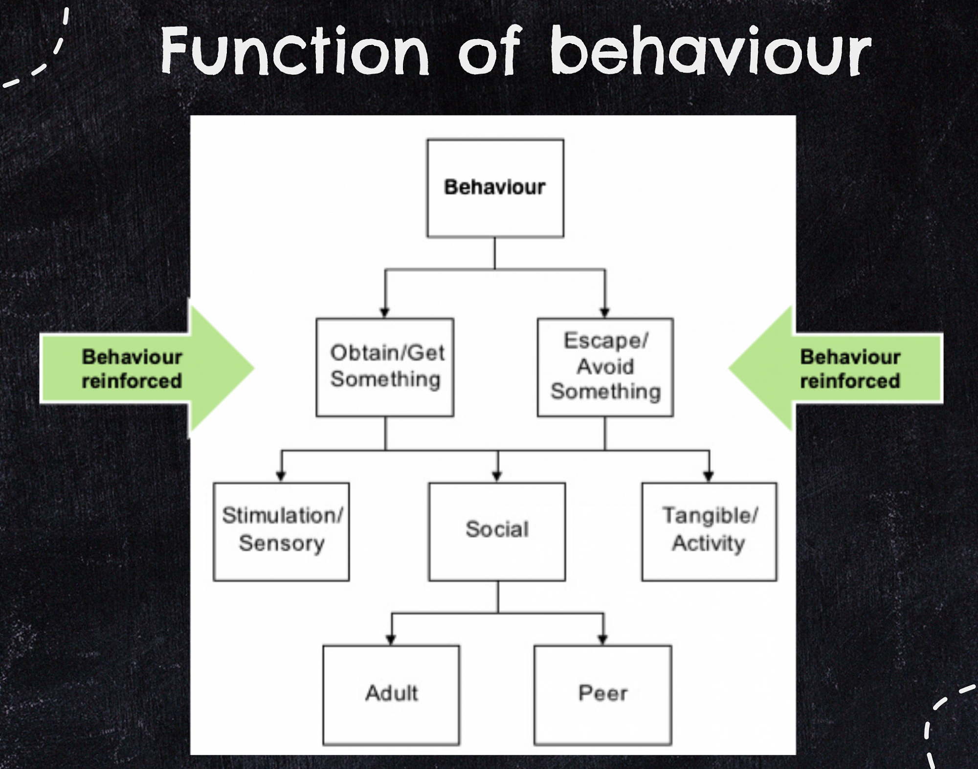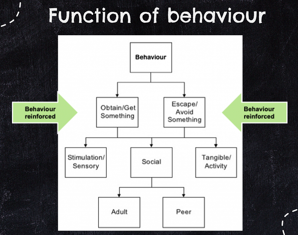 The chart below maps out the function of behaviour, which is useful to use when trying to understand why a child has behaved in a certain way. We can then look at ways for the child to still have that need met by replacing their negative behaviour for a positive behaviour or in a positive way.