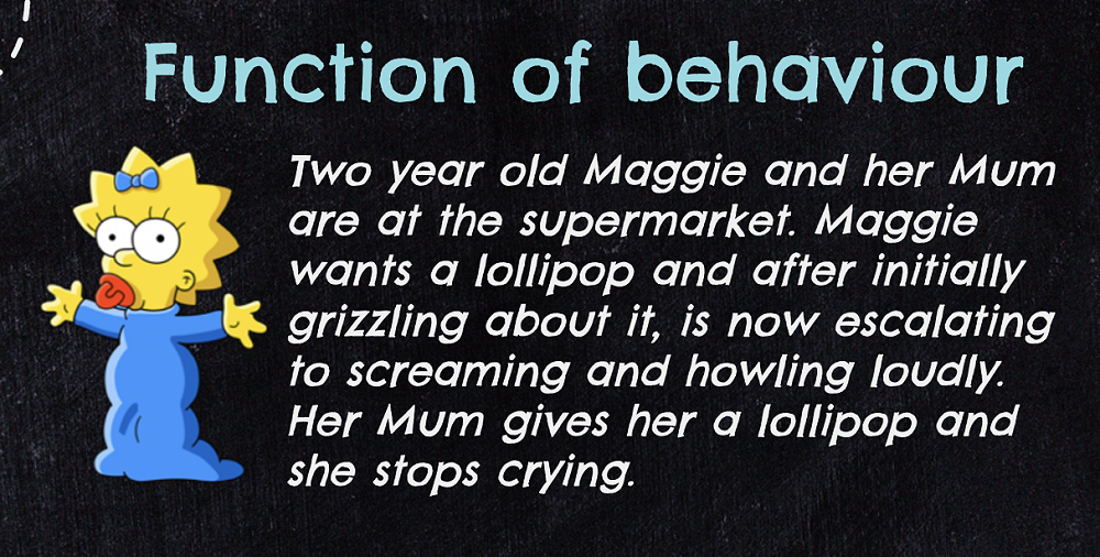 In a familiar scenario to most of us, (see below) what do you think the function of Maggie's behaviour is? Also, what is the function of her mum's reaction/behaviour? Does it stop this behaviour or reinforce it?