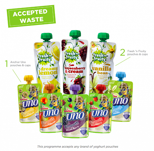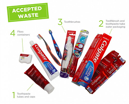 In the school admin area there are recycling stations that you can put your old toothpaste tubes, toothbrushes, plastic toothbrush packaging, interdental brushes, wisps, pumps, stand up toothpaste bottles and any kind of non-electric toothbrush or toothpaste tube and all affiliated non-recyclable packaging in. There is also a station for the yoghurt pouches.