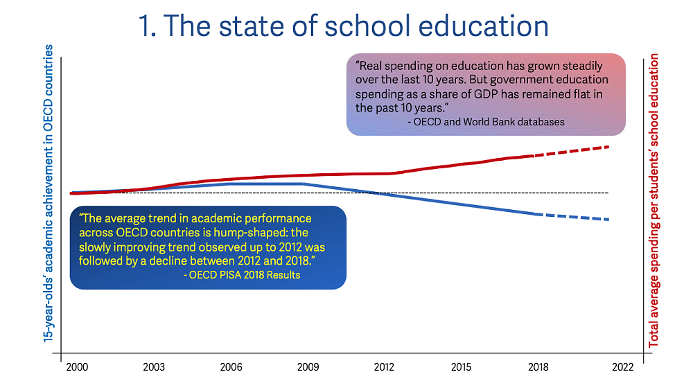 While we hear a great deal in the media about a decline in NZ educational achievement, we don't often hear that this is part of a worldwide trend. Pasi shared an analysis of OECD achievement data in all OECD countries, noting that across all OECD countries, as educational spending had increased, student achievement had decreased.