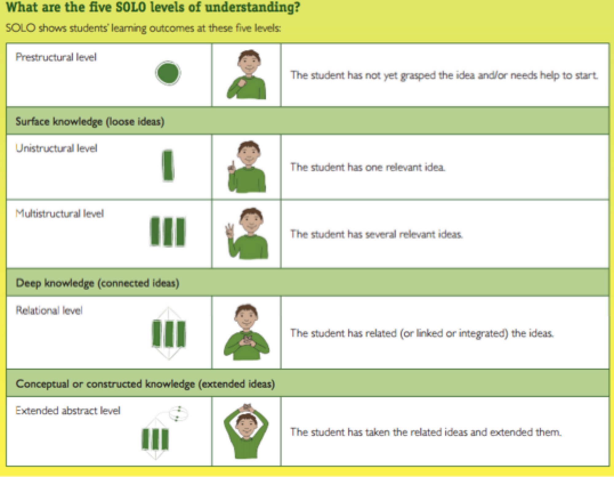 Your children may have been talking about SOLO Taxonomy at home, so below is some brief information to guide your understanding. They might have mentioned some of the SOLO levels or talked about the hand signals and symbols that are being introduced at school.