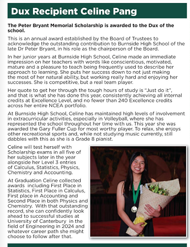 Celine Pang was awarded Dux at Burnside High School. Celine attended our kura from years 1 to 8. In 2019 she was awarded the Pritchard Badger Cup for SMP. At Burnside, Celine was awarded the Peter Bryant Memorial Award, the AIMS Scholarship for Maths99 and a Woman in Engineering Scholarship. Celine will study Engineering at the University of Canterbury.