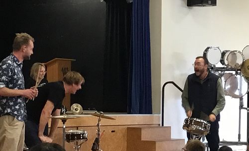 Afterwards, they got the audience to pick two teachers to have a drum-off for a prize. The teachers were picked and Mr Harding and Mr Yates came to the stage. Once they got to the stage they started with Mr Yates hitting a drum on the beat 2 and 4 and Mr Harding hitting a cymbal on the beat 1, 2, 3 and 4. After a while it was time to do their solos, Mr Yates was first and did an outstanding job. Then it was Mr Harding’s turn and he also did an amazing job and got the whole school clapping their hands! But it wasn't over, it was a drum battle right? So the judging was a very hard decision but it had to be done. Mr Harding was the winner! He won a delicious chocolate egg.