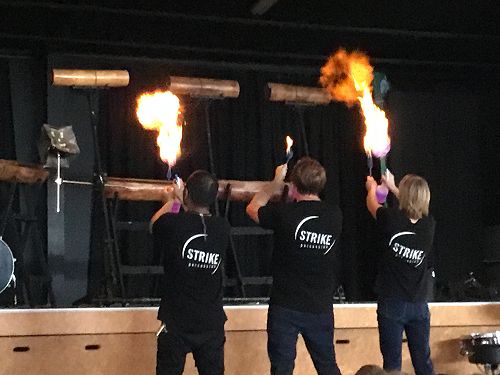 For a grand finale, they got Isla and Isla to turn off the lights. Murray then lit three matches and distributed them among the group. The band then got spray bottles of disinfectant and held a match in one hand, disinfectant in the other. They held the matches out in front of them, and held the bottles of disinfectant a few centimetres behind. Then they sprayed the disinfectant! When the disinfectant hit the matches, it caught fire, and then it kept going forward, creating two metre long fountains of flame that shot forward with a whooshing sound towards the audience, stopping just a few metres away from them! The band proceeded to play a piece of music, using the whooshing sound the flames created to create a tune, firing flames in all directions! When they finished, they blew out their matches, the lights were turned back on, and they took a bow to ear-shattering applause.