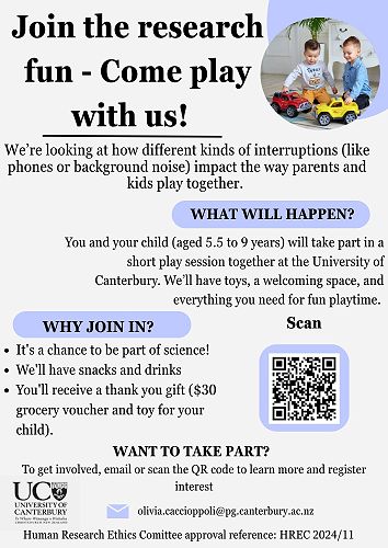Research opportunity - My name is Sasha Johnstone, and I am part of a research team at the University of Canterbury. We are conducting a study on how different kinds of interruptions (like phones or background noise) impact the way parents and kids play together. This study is an excellent opportunity for families to engage in scientific research and enjoy a fun play session. All participating parents and children will receive a thank-you gift.