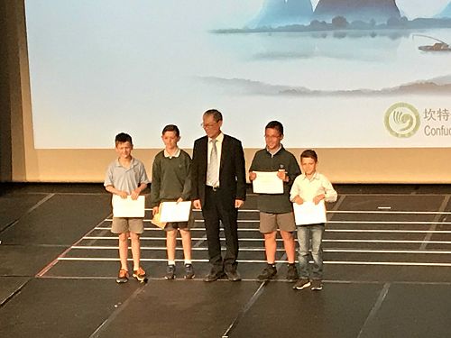 The Excellent Learner Awards for primary students were presented by Christchurch City Councillor, Jimmy Chen. Lucas Wieblitz, Kaleb Wieblitz, Callum Maule, Aaron Zhang, Hamish Giddens, Frederico Rubin, Jamie Wood, Lena Ahn, Sebastian Enoka and Lucy Gallagher from Westburn received awards for their excellent attitude, progress and participation in Mandarin language lessons.