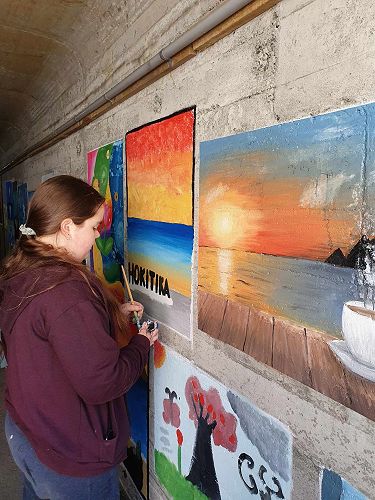 These girls not only had a part in a history making event they also showed tenacity and resiliency by giving up time during the holidays and a weekend. Their paintings and those done by the other students from West Coast schools can be found in the rail-line underpass just off state highway 73 in Ōtira.