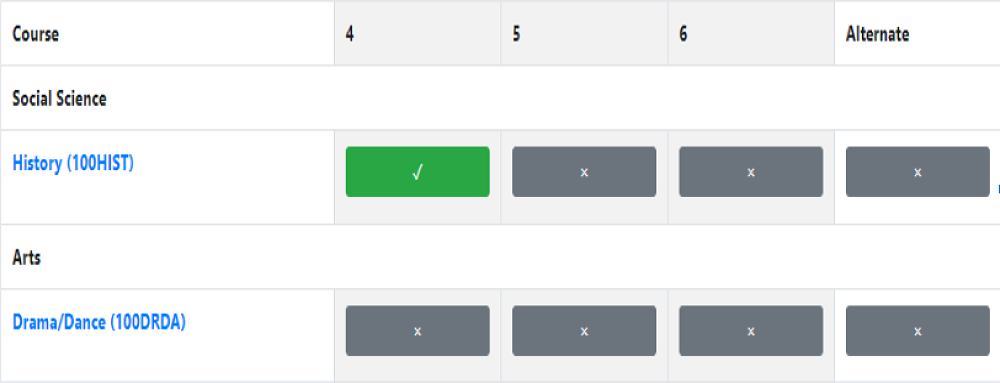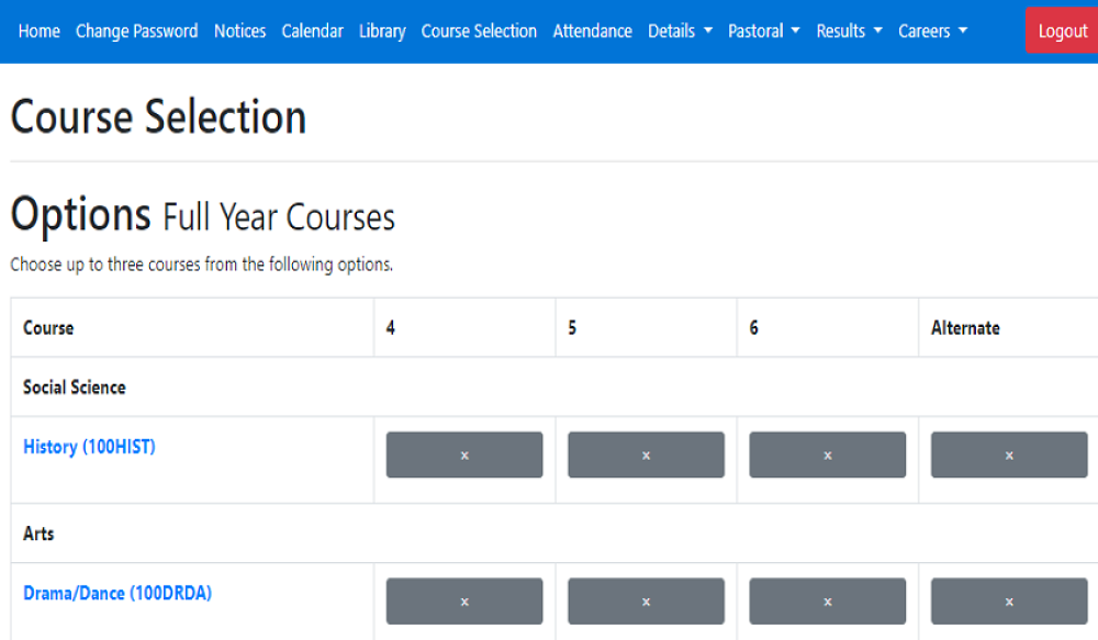Select one course in each column the buttons will turn green with a tick once selected. Year 11 core courses are preselected in yellow at the bottom of the page.