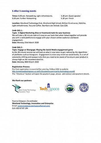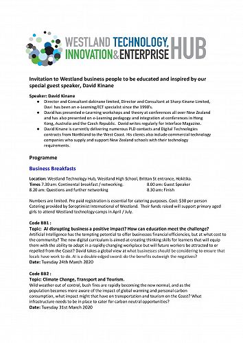 Business Breakfasts:Location: Westland Technology Hub, Westland High School, Brittan St entrance, Hokitika.Times: 7.30am Continental breakfast / networking. 8.00am Guest Speaker8.20am Questions and further networking 8.30am Finish.Numbers are limited. Pre paid registration is essential for catering purposes.